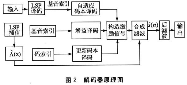 在解碼過程中,每一幀都要進行LP濾波器參數(shù)解碼。接收到的LSP系數(shù)索引用于重構(gòu)LSP系數(shù),然后將LSP系數(shù)內(nèi)插得到4組內(nèi)插LSP矢量(對應于4個子幀),對于每一個子幀,內(nèi)插LSP矢量都要轉(zhuǎn)化為LP濾波器系數(shù)ak,該系數(shù)用來在子幀中合成重構(gòu)語音信號?!?/p>