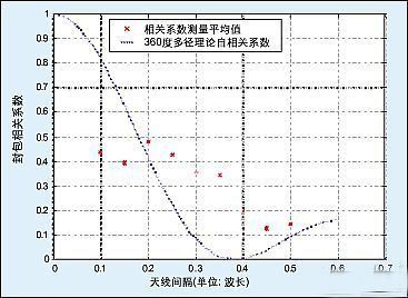利用所開發(fā)的硬件測試平臺進行了廣泛的測量,包括手機分集測量、天線間隔和操作員身體對分集的影響、自適應波束形成、到達角、信道互易驗證,以及寬帶向量信道測量。圖5和圖6給出了戶外非直線可視信道的采樣分集測量。圖5對比相對于天線間隔的相關系數(shù),注意到當相關性遠低于0.7時將十分有利于提高分集性能。圖6給出了分集增益與天線間隔的函數(shù)關系:99%可靠性時,增益約9dB;90%可靠性時,增益約5-dB。當間隔降至0.1波長時,幾乎沒有關聯(lián)關系了。