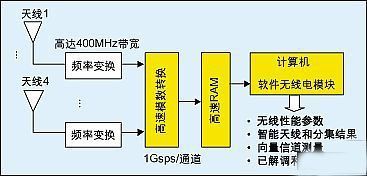 VIPER被設計成在最少的RF硬件條件下,在軟件中實現(xiàn)處理功能。圖4給出了接收器硬件的模塊示意圖。執(zhí)行單階下變頻后,在四個信道的每一個信道的IF信號以每秒1G的采樣率被采樣。所采集樣本信號存儲在RAM中,并由計算機處理。