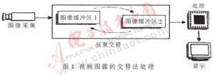 視頻技術(shù)以其直觀和信息量大而備受青睞,在軍事上如慣導(dǎo)、紅外成像等方面取得了一定的應(yīng)用,一些先進(jìn)的飛機(jī)上專門為此設(shè)計(jì)了顯示與控制系統(tǒng)。視頻圖像信息通過兩種方式供人們使用:一是直接觀看(包括先記錄后觀看),即通過人腦分析使用信息;二是信號(hào)處理,多采用計(jì)算機(jī)處理,將處理結(jié)果顯示或用于控制。后者處理和控制速度快,不足的是只能對(duì)圖像的明顯特征進(jìn)行處理。有時(shí)需將二者結(jié)合,邊自動(dòng)分析和控制,邊輔以人工監(jiān)視。計(jì)算機(jī)對(duì)視頻信號(hào)處理前需將視頻信號(hào)數(shù)字化,由A/D" title="A/D">A/D完成,一般采用交替法,即設(shè)立二個(gè)交替工作的幀存儲(chǔ)器,一個(gè)存儲(chǔ)視頻圖像的同時(shí),另一個(gè)輸出信息供處理器使用。經(jīng)過一個(gè)周期后,二者功能交換,前者輸出信息而后者存入信息,如此往復(fù)。其功能框圖如圖1。工作處理周期一般取20ms,因視頻信號(hào)的周期是20ms,它包含一幅完整的視頻圖像信息。同時(shí)處理器也需要一定的時(shí)間,一般要求在20ms(或其整數(shù)倍)內(nèi)完成處理。