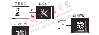 將數(shù)字字符轉(zhuǎn)化成光柵掃描形式的視頻畫面(如計(jì)算機(jī)監(jiān)視器),然后與視頻圖像疊加,合成一幅圖像,這樣只用一種掃描方式(光柵掃描)就可將數(shù)字和圖像信息全部顯示出來。原理框圖見圖2。