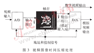 對(duì)一幅圖像進(jìn)行時(shí)間壓縮而不損失其完整性,就要求對(duì)圖像不同部位延遲不同的時(shí)間:對(duì)先掃描的行延遲較多的時(shí)間,接下來逐行線性減少,直到最后一行延遲時(shí)間最少(甚至為0),然后再送顯示。傳統(tǒng)的模擬延遲線無法實(shí)現(xiàn),必須采用數(shù)字化存儲(chǔ)延時(shí)。顯然這里對(duì)圖像信號(hào)只進(jìn)行延時(shí)(處理),不需要等到一幅完整的畫面完全存儲(chǔ)后再處理。因此可以只設(shè)置一個(gè)幀存,它由一塊雙端口存儲(chǔ)器(Dual-Port RAM)構(gòu)成。如圖3。