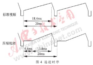 系統(tǒng)要求將周期20ms、正程顯示時(shí)間18.4ms的標(biāo)準(zhǔn)PAL制式視頻壓縮1/4,壓縮為周期20ms、正程顯示時(shí)間13.8ms的視頻,即在掃描周期不變的情況下,將正程顯示時(shí)間壓縮1/4。工作過程描述如下: