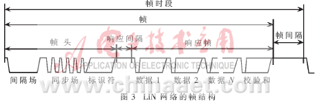 ??? 一個報文幀由一個幀頭(由主機任務(wù)模塊提供)和一個響應(yīng)幀(由從機任務(wù)模塊提供)組成。幀頭包括一個同步間隔場(SYNCH BREAK FIELD)、 一個同步場(SYNCH FIELD)和一個標識符場。報文幀的用途由標識符唯一定義,約定的從機任務(wù)根據(jù)標識符提供相關(guān)的響應(yīng)幀并發(fā)送到總線上(如圖2、圖3所示),響應(yīng)幀由2、4或8字節(jié)的數(shù)據(jù)場(DATA FIELD)和一個校驗和場(CHECKSUM FIELD)組成。對這個標識符相聯(lián)的數(shù)據(jù)感興趣的從機任務(wù)將接收響應(yīng)幀,校驗和檢驗通過后對數(shù)據(jù)進行處理。