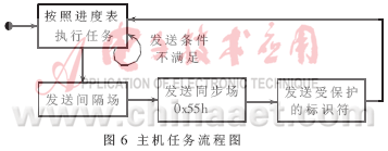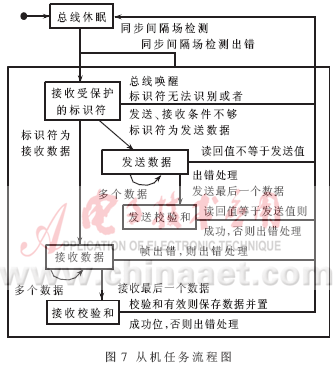 ??? LIN節(jié)點是通過應(yīng)用程序中的主機任務(wù)和從機任務(wù)來實現(xiàn)LIN網(wǎng)絡(luò)通訊的。主機節(jié)點包含主機任務(wù)和從機任務(wù),從機節(jié)點僅包含從機任務(wù)。主機任務(wù)流程圖如圖6所示,從機任務(wù)流程圖如圖7所示。