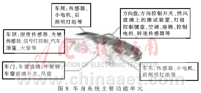 ??? 根據(jù)電動汽車A類網(wǎng)絡(luò)各功能單元對通訊功能的實時性、傳輸距離的要求,均衡考慮性能和成本等因素,確定LIN總線在電動汽車車身上的網(wǎng)絡(luò)結(jié)構(gòu),可以從圖8中幾個典型的A類網(wǎng)絡(luò)功能單元進行分析。