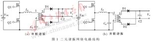 用兩個(gè)元件組成的諧振拓樸結(jié)構(gòu)主要有兩種:并聯(lián)結(jié)構(gòu)和串聯(lián)結(jié)構(gòu),分別如圖1(a)和圖1(b)所示。串聯(lián)諧振在輕負(fù)載時(shí)具有較高的效率,而在滿負(fù)載時(shí)轉(zhuǎn)換效率比較低;并聯(lián)諧振則反之,在滿負(fù)載時(shí)具有較高的轉(zhuǎn)換效率,而在輕負(fù)載時(shí)轉(zhuǎn)換效率比較低。而且串聯(lián)諧振和并聯(lián)諧振都要求較寬的頻率范圍[1]。因此,這種二元的諧振網(wǎng)絡(luò)在實(shí)際應(yīng)用中都有一定的限制。