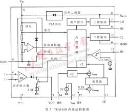 TEA1610是Philips公司推出的零電壓全諧振半橋控制器,是采用高壓DMOS工藝的芯片,高側(cè)開關(guān)管" title="開關(guān)管">開關(guān)管的驅(qū)動(dòng)耐壓最大可達(dá)600V,最大的振蕩頻率達(dá)1MHz。其內(nèi)部結(jié)構(gòu)如圖5所示[4]。