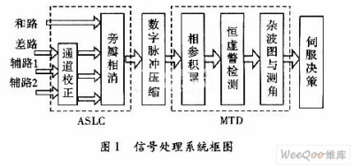 回波信號(hào)在天線上進(jìn)行部分微波合成,形成和、差通道信號(hào)及兩路輔助天線信號(hào),進(jìn)行IQ正交插值,1/8抽取后,形成4路待測(cè)數(shù)據(jù),數(shù)據(jù)率共為128MB/s。系統(tǒng)算法結(jié)構(gòu),如圖1所示,主要由旁瓣相消模塊,數(shù)字脈壓模塊,MTD處理模塊由3部分組成。和路信號(hào)MTD(FFT-CFAR)后經(jīng)副瓣匿影若判定有目標(biāo)則再由和、差兩路數(shù)據(jù)計(jì)算方位偏差量。