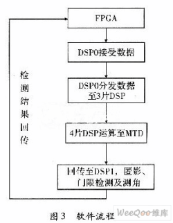 系統(tǒng)算法的復(fù)雜性與計(jì)算中的動(dòng)態(tài)范圍的要求,系統(tǒng)算法在DSP中軟件化設(shè)計(jì),調(diào)試方便?;夭ń?jīng)微波合成后形成和、差路及兩路輔助通道信號(hào),A/D采樣正交差值后形成4路數(shù)據(jù)經(jīng)光纖傳入FPGA,DSP0經(jīng)總線以DMA方式接收4路數(shù)據(jù),并分發(fā)至其它3片DSP。各DSP單獨(dú)處理一路數(shù)據(jù),如圖2所示,MTD后回傳至DSP1進(jìn)行副瓣匿影及門限檢測(cè),并估算目標(biāo)方位偏差量,檢測(cè)結(jié)果由DSP1經(jīng)總線以DMA方式返還至FPGA,所有的模塊限制在1個(gè)脈沖周期內(nèi)完成,形成了圖3的軟件流程圖。