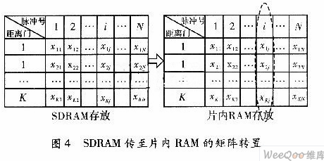 MTD是對(duì)同一距離單元上的脈壓數(shù)據(jù)進(jìn)行處理,因此要求在DMA傳輸?shù)倪^程中實(shí)現(xiàn)矩陣行列轉(zhuǎn)置,8個(gè)脈沖周期的數(shù)據(jù)量已經(jīng)超出了普通一維DMA傳輸方式的上限,且若在SDRAM中跳址傳輸,遭遇頻繁的跨頁尋址時(shí)會(huì)耗費(fèi)更多時(shí)間。采用二維DMA傳輸方式,通過改變TCB配置使DMA傳輸在SDRAM中連續(xù)尋址,而在DSP端接收地址自動(dòng)跳變,在矩陣傳輸?shù)耐瑫r(shí)實(shí)現(xiàn)行列轉(zhuǎn)置。系統(tǒng)時(shí)鐘為50 MHz,傳輸時(shí)間為86 208/50=1.73 ms,DMA傳輸方式無需消耗內(nèi)核時(shí)鐘,占用總線時(shí)間僅為1.73 ms,滿足了傳輸時(shí)間的要求。