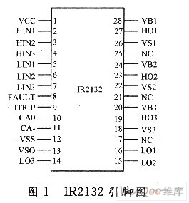 IR2132可以用來(lái)驅(qū)動(dòng)工作在母線電壓不高于600 V的電路中的功率MOS門(mén)器件,其可輸出的最大正向峰值驅(qū)動(dòng)電流為250 mA,而反向峰值驅(qū)動(dòng)電流為500 mA。它內(nèi)部設(shè)計(jì)有過(guò)流、過(guò)壓及欠壓保護(hù)、封鎖和指示網(wǎng)絡(luò),使用戶可方便地用來(lái)保護(hù)被驅(qū)動(dòng)的MOS門(mén)功率管,加之內(nèi)部自舉技術(shù)的巧妙運(yùn)用使其可以用于高壓系統(tǒng),它還可以對(duì)同一橋臂上下兩個(gè)功率器件的門(mén)極驅(qū)動(dòng)信號(hào)產(chǎn)生O.8μs互鎖延時(shí)時(shí)間。它自身工作和電源電壓的范圍較寬(3~20 V),在它的內(nèi)部還設(shè)計(jì)有與被驅(qū)動(dòng)的功率器件所通過(guò)的電流成線性關(guān)系的電流放大器,電路設(shè)計(jì)還保證了內(nèi)部的3個(gè)通道的高壓側(cè)驅(qū)動(dòng)器" title="驅(qū)動(dòng)器">驅(qū)動(dòng)器和低壓側(cè)驅(qū)動(dòng)器可單獨(dú)使用,亦可只用其內(nèi)部的3個(gè)低壓側(cè)驅(qū)動(dòng)器,并且輸入信號(hào)與TTL及CMOS電平兼容。IR2132管腳如圖1所示。VBl~VB3是懸浮電源接地端,通過(guò)自舉電容為3個(gè)上橋臂功率管的驅(qū)動(dòng)器提供內(nèi)部懸浮電源,VSl~VS3是其對(duì)應(yīng)的懸浮電源地端。