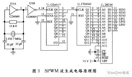 采用了一種新型的預(yù)制相位PWM波的數(shù)字控制方案,逆變器6個(gè)開(kāi)關(guān)管的開(kāi)關(guān)狀態(tài)同某一調(diào)制比的SPWM脈沖相對(duì)應(yīng),其出發(fā)點(diǎn)是由一片EP-ROM來(lái)存儲(chǔ)這6個(gè)開(kāi)關(guān)管的開(kāi)關(guān)狀態(tài),預(yù)置于EPROM內(nèi)的由多種方式產(chǎn)生,常見(jiàn)的是先計(jì)算出來(lái),對(duì)應(yīng)于不同的基波頻率,按一定規(guī)律算出相對(duì)應(yīng)的脈寬,再轉(zhuǎn)換成數(shù)值,存儲(chǔ)在EPROM內(nèi),EPROM的輸出與IR2132的HINl~HIN3,LINl~LIN3相連接。同一橋臂開(kāi)關(guān)管之間相位互差120°,同橋臂上下開(kāi)關(guān)互補(bǔ)導(dǎo)通且有死區(qū)。其SPWM波生成電路原理如圖3所示。