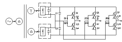 三電平變頻器主電路示意圖如圖1所示。其中,移相變壓器一次為△接,二次側(cè)分別為Y接和△接的兩個(gè)對(duì)稱繞組。兩個(gè)二次繞組的輸出分別經(jīng)過兩個(gè)完全相同的6 脈波整流單元形成12脈波整流器。12脈波整流器可使各6脈波二極管整流器產(chǎn)生的低次諧波相互抵消,從而降低網(wǎng)側(cè)電流的諧波畸變,提高網(wǎng)側(cè)的功率因數(shù)。一般來說,二極管整流器脈波數(shù)目越多,輸出網(wǎng)側(cè)電流的諧波畸變?cè)叫?。但在?shí)際產(chǎn)品中很少采用脈波數(shù)多于30的二極管整流器,主要原因在于變壓器的成本會(huì)增加很多,而性能的改變卻不明顯。因此,本文采用12脈波二極管整流。