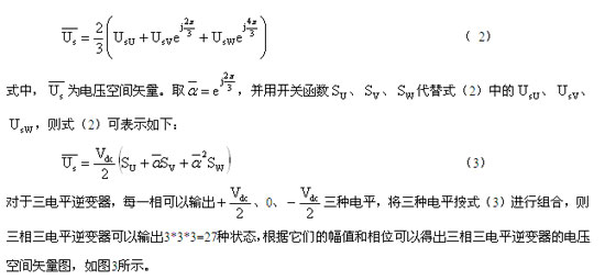 由圖1可見,每一個(gè)橋臂上有4個(gè)IGBT、2個(gè)箝位二極管和4個(gè)反向恢復(fù)二極管。以A相為例,當(dāng) 和 或者它們的體二極管導(dǎo)通時(shí),電機(jī)定子A相電壓為 ;當(dāng) 和 或者們的體二極管導(dǎo)通時(shí),定子A相電壓為 ;當(dāng) 和 導(dǎo)通時(shí),定子A相電壓為0。 和 不可能同時(shí)導(dǎo)通,哪一個(gè)導(dǎo)通取決于A相負(fù)載電流的方向。因此,對(duì)于三電平逆變器來說其交流側(cè)電壓有 、0、 3種狀態(tài),3個(gè)橋臂進(jìn)行組合,共有 =27種開關(guān)狀態(tài),即有27個(gè)空間電壓矢量。該拓?fù)浣Y(jié)構(gòu)的不足之處在于:三電平及以上逆變器需要器件數(shù)量較多,控制復(fù)雜性明顯增加以及中性點(diǎn)電壓發(fā)生波動(dòng)。
