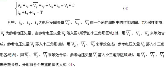 由于空間矢量圖的對(duì)稱特性,只分析其中的一個(gè) 區(qū)域即可,如圖4中的大三角形。當(dāng)參考矢量落入某一個(gè)三角形區(qū)域中時(shí),為了在輸出得到相應(yīng)頻率的正弦波電壓和減少輸出電壓的諧波含量,就用組成該三角形的三個(gè)矢量合成該參考矢量,各矢量的作用時(shí)間和參考矢量的關(guān)系,應(yīng)該滿足如下公式: