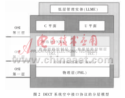 ??? DECT的空中接口協(xié)議與綜合業(yè)務(wù)數(shù)字網(wǎng)相類似,是基于開放系統(tǒng)互連(OSI)原則的??刂破矫?C平面)和用戶平面(U平面)使用較低層(即物理層和中間接入控制層)提供的服務(wù)。DECT系統(tǒng)能夠支持超過(guò)10000個(gè)用戶/平方公里(商業(yè)和辦公環(huán)境)而不需要知道用戶位于哪個(gè)小區(qū)。但它不是一個(gè)完全的系統(tǒng)概念。這一點(diǎn)與其它系統(tǒng),如GSM、CDMA等蜂窩移動(dòng)通信系統(tǒng)標(biāo)準(zhǔn)不同。它是為無(wú)線本地環(huán)路(WLL)或城市區(qū)域接入而設(shè)計(jì)的,但它可用于與蜂窩移動(dòng)通信系統(tǒng)(如GSM)相連接。DECT可根據(jù)便攜式手機(jī)所接收的信號(hào)動(dòng)態(tài)地分配信道,且系統(tǒng)設(shè)計(jì)僅為普通移動(dòng)速度的用戶提供越區(qū)切換和漫游。DECT系統(tǒng)空中接口協(xié)議的分層模型如圖2所示。?