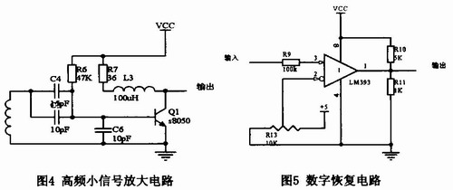 本次所設(shè)計(jì)的閱讀器電路由耦合線圈、放大電路、解調(diào)電路、解碼電路和單片機(jī)顯示電路組成。耦合線圈及放大器電路設(shè)計(jì)如圖4所示。為了使閱讀器線圈的耦合效率高,可將通過該線圈并聯(lián)可調(diào)電容,使其諧振頻率和應(yīng)答器的工作頻率一致,使閱讀器線圈工作在諧振狀態(tài),并聯(lián)諧振回路的諧振頻率可由式(1)計(jì)算: