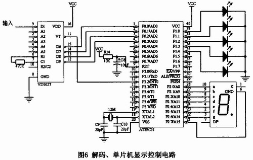 。數(shù)字恢復(fù)電路采用LM393,如圖5所示,它的作用是將解調(diào)輸出模擬信號(hào)恢復(fù)為數(shù)字信號(hào),以便解碼器識(shí)別。解碼、單片機(jī)顯示控制電路如圖6所示。