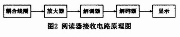 閱讀器接收電路由耦合線圈、放大器、解調(diào)器、解碼器和顯示部分組成。通過耦合線圈所得的電壓信號(hào)經(jīng)過放大器放大后,再經(jīng)解調(diào)器解調(diào)得到載波信號(hào),再經(jīng)解碼器解碼和顯示電路得到應(yīng)答器所發(fā)送的數(shù)據(jù)。