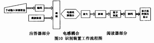 識(shí)別裝置工作流程如圖10所示。此無線識(shí)別裝置由手動(dòng)輸入信息,經(jīng)編碼器編碼,采用ASK調(diào)制方式,載波為13.56MHz,經(jīng)線圈耦合發(fā)送。閱讀器將接收到的ASK信號(hào)放大后,經(jīng)二極管包絡(luò)檢波,送至數(shù)字恢復(fù)電路后,再解碼。解碼正確時(shí),由單片機(jī)顯示結(jié)果。