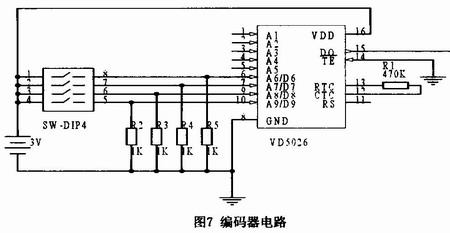 編碼器設(shè)計(jì)由撥碼開關(guān)和編碼芯片VD5026構(gòu)成,信息由撥碼開關(guān)生成。電路圖如圖7所示。