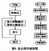 VD5027解碼正確時(shí),17管腳輸出高電平,4位數(shù)據(jù)由管腳10、11、12、13輸出。因此單片機(jī)設(shè)置為中斷模式,VD5027的17管腳經(jīng)反向后接在單片機(jī)的中斷0入口處。主程序?yàn)樾菝叩却隣顟B(tài),當(dāng)有應(yīng)答器且解碼正確時(shí),響應(yīng)中斷服務(wù)子程序,顯示相應(yīng)的信息。其流程如圖9所示。