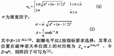 當(dāng)u=2mπ,m=O,±1,…時(shí),S取最大值,且m=0時(shí)為主瓣。為了實(shí)現(xiàn)低副瓣并使主瓣展寬,采用中心饋電從陣中到邊緣幅度遞減,按泰勒線源分布加權(quán)各縫隙,兩邊呈對(duì)稱分布,其方向圖零點(diǎn)位置由下式?jīng)Q定:
