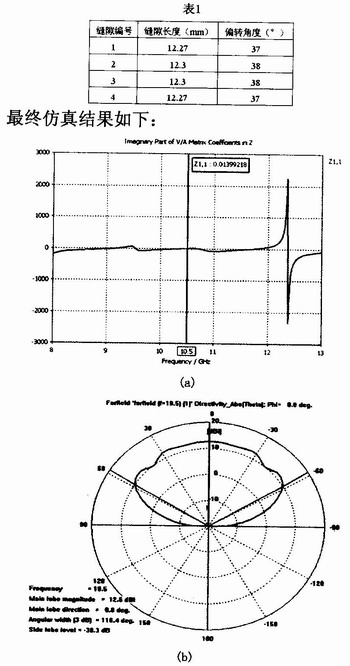 應(yīng)用以上所計(jì)算出來的結(jié)果來進(jìn)行天線的設(shè)計(jì),還必須考慮縫隙間的互耦問題;若不考慮互耦,將使天線口徑面的幅度分布和相位分布變壞,同時(shí)也將惡化天線的輸入端匹配。近年來隨著計(jì)算機(jī)輔助技術(shù)的飛速發(fā)展,在設(shè)計(jì)比較小的縫隙陣列時(shí),通過仿真得到近場(chǎng)數(shù)據(jù)的近場(chǎng)診斷法越來越受到重視。在縫隙數(shù)為4的情況下,根據(jù)上面得出的參數(shù),結(jié)合CST軟件中參數(shù)掃描的功能,能夠快速地找到準(zhǔn)確的電參數(shù),大大提高了設(shè)計(jì)的效率。
