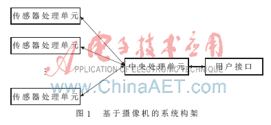 在集中式系統(tǒng)結構[1]中,各個攝像機采集的視頻數(shù)據直接被送到融合中心,在那里進行數(shù)據對準、數(shù)據相關、航跡記錄、預測與綜合跟蹤等,而相機無自主處理能力。這種結構的特點是信息損失小、精度高,但其對系統(tǒng)通信要求較高,融合中心計算負荷重,系統(tǒng)效率低,實時性差。因此該結構的實用性差,生存能力低。