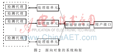 參考文獻[5]提出了一種面向對象的多攝像機結構。系統(tǒng)主要分為檢測代理SDA(Specialized Detection Agency)、處理組單元PRC(Processing Cluster)、群組管理單元CM(Cluster Manager)和用戶接口GUI等。系統(tǒng)構架如圖2所示。
