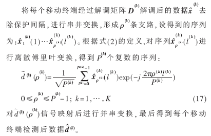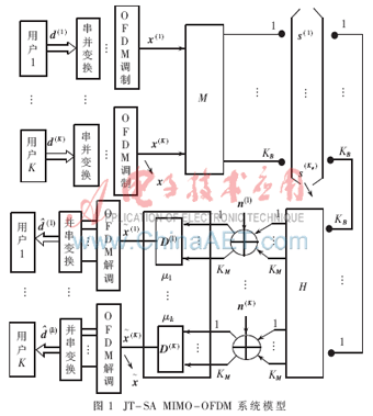 圖1給出了JT-SA MIMO-OFDM系統(tǒng)模型。基于此系統(tǒng)模型的數(shù)據(jù)發(fā)送及檢測(cè)算法的原理是首先在基站將發(fā)送給移動(dòng)終端的數(shù)據(jù)串并變換后進(jìn)行OFDM調(diào)制,然后進(jìn)行聯(lián)合發(fā)送,基站發(fā)送天線采用智能天線下行波束形成技術(shù),移動(dòng)終端將經(jīng)過匹配濾波后的數(shù)據(jù)進(jìn)行OFDM解調(diào)后再進(jìn)行并串變換即可得到檢測(cè)后的數(shù)據(jù)。