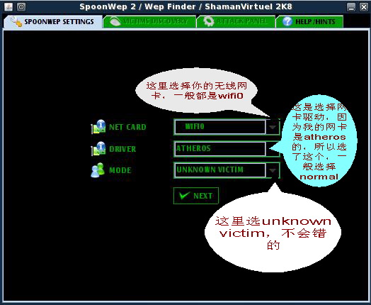 啟動(dòng) spoonwep2 后會(huì)看到選擇網(wǎng)卡信息設(shè)置窗口,需要我們依次設(shè)置本地網(wǎng)卡接口,無線網(wǎng)卡芯片類型以及掃描模式,選擇完畢后點(diǎn) next 繼續(xù)。如圖: