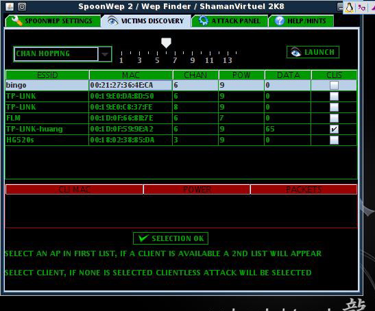 你選擇一個(gè)進(jìn)行無線路由器破解,我選了“bingo”, 用鼠標(biāo)單擊bingo,會(huì)出現(xiàn)上圖一樣的白色陰影,然后點(diǎn)下面的“selection ok”即可。