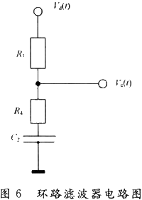 本設(shè)計(jì)選取無(wú)源比例積分濾波器作為環(huán)路濾波器,其時(shí)間常數(shù)r=(R3+R4)C2。電路如圖6所示。