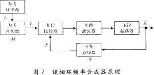 可變分頻器對(duì)壓控振蕩器的輸出信號(hào)進(jìn)行分頻,分頻之后返回到相位比較器輸入端與參考信號(hào)進(jìn)行比較。當(dāng)環(huán)路處于鎖定時(shí)有f1=f2,因?yàn)閒1=fr/M,f2=fo/N,所以有fo=Nfr/M。只要改變可變分頻器的分頻系數(shù)N,就可以輸出不同頻率的信號(hào)。