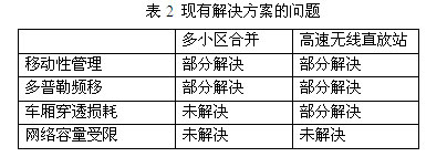 從上述現(xiàn)有方案描述和分析看,現(xiàn)有的高速移動(dòng)場景覆蓋解決方案解決了移動(dòng)性管理、穿透損耗、多普勒頻偏的部分問題,一定程度上保證了終端用戶基本業(yè)務(wù)(如語音、低速數(shù)據(jù))的需求,但仍然存在一些明顯的問題,見下表: