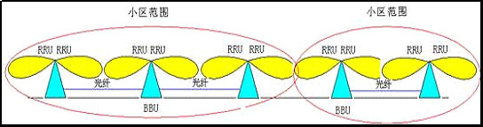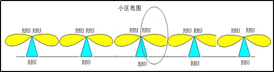 普通小區(qū)結(jié)構(gòu)即單扇區(qū)覆蓋一個(gè)小區(qū),單個(gè)小區(qū)覆蓋范圍有限。其中BBU為基站基帶單元,RRU為基站射頻單元。